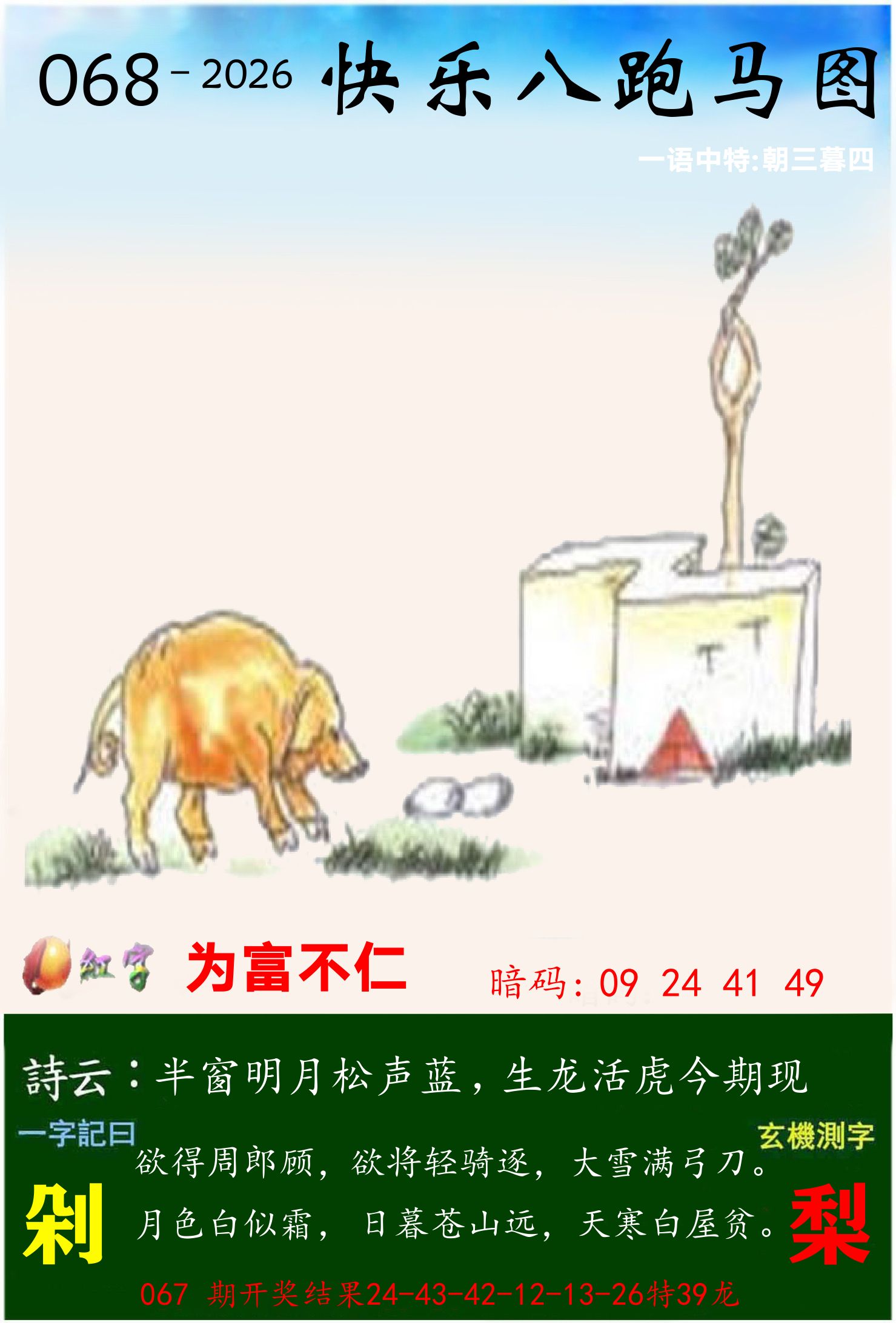 068期〖澳利澳六肖⑱码〗开: ?? 准 牛[42 30 06] 马[01 25 49] 狗[45 33 09] 羊[24 48 36] 鸡[10 46 22] 兔[40 04 28]